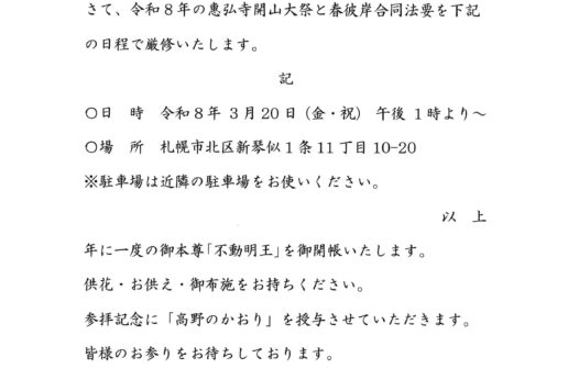令和八年、新しい年を迎えました。惠弘寺は、新持建立から丸三年を迎えることができました。 小さな一軒家のお寺として歩み始めて十一年。決して大きくも、立派でもありませんが、多くの方の想いと力に支えられ、ここまで歩んでくるこ...